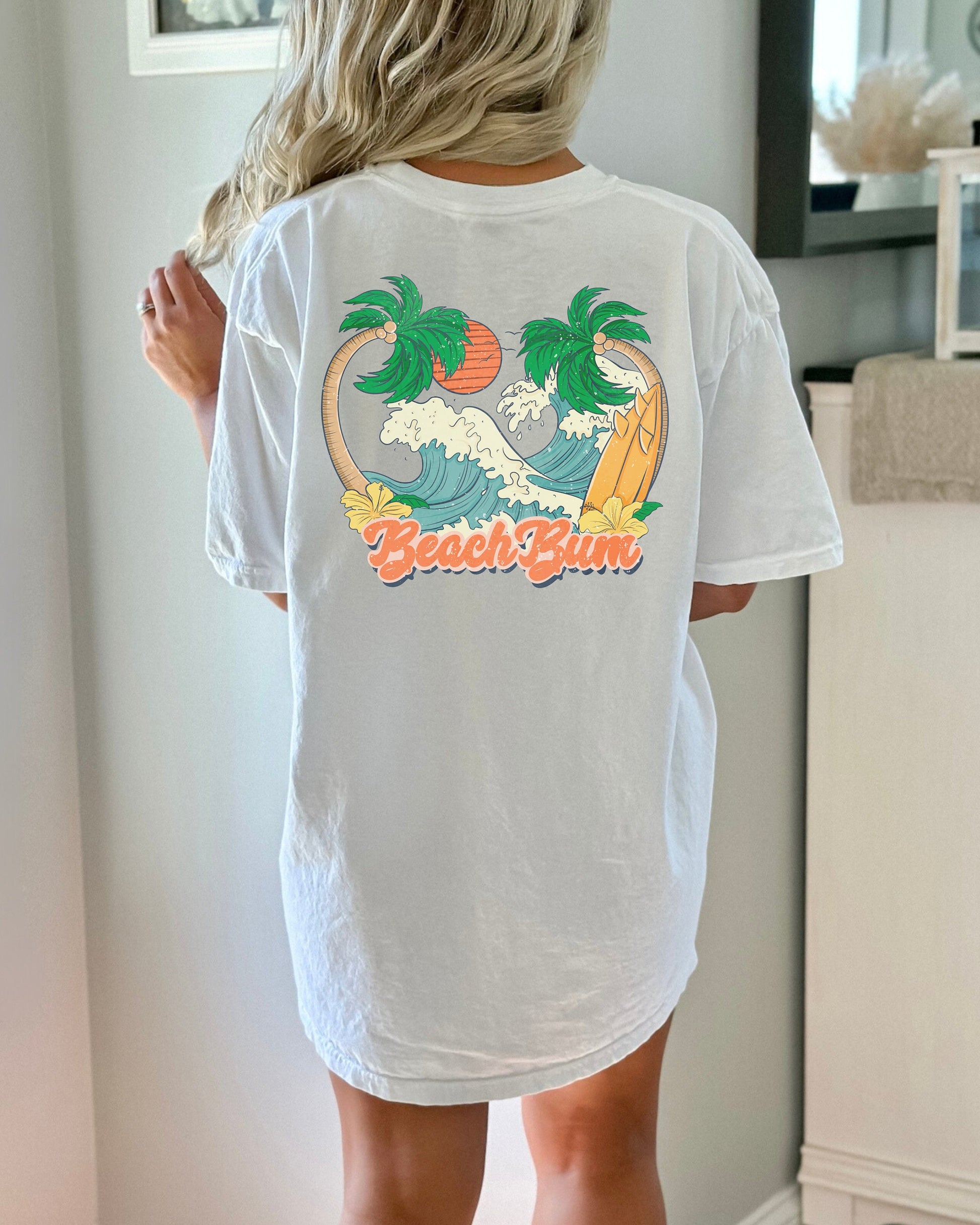 Our Retro style Beach Bum Comfort Color Tee is the perfect addition to your summer wardrobe. Sun, Sand, Waves, and a Surfboard set the Vintage mood for breezy vacation days.