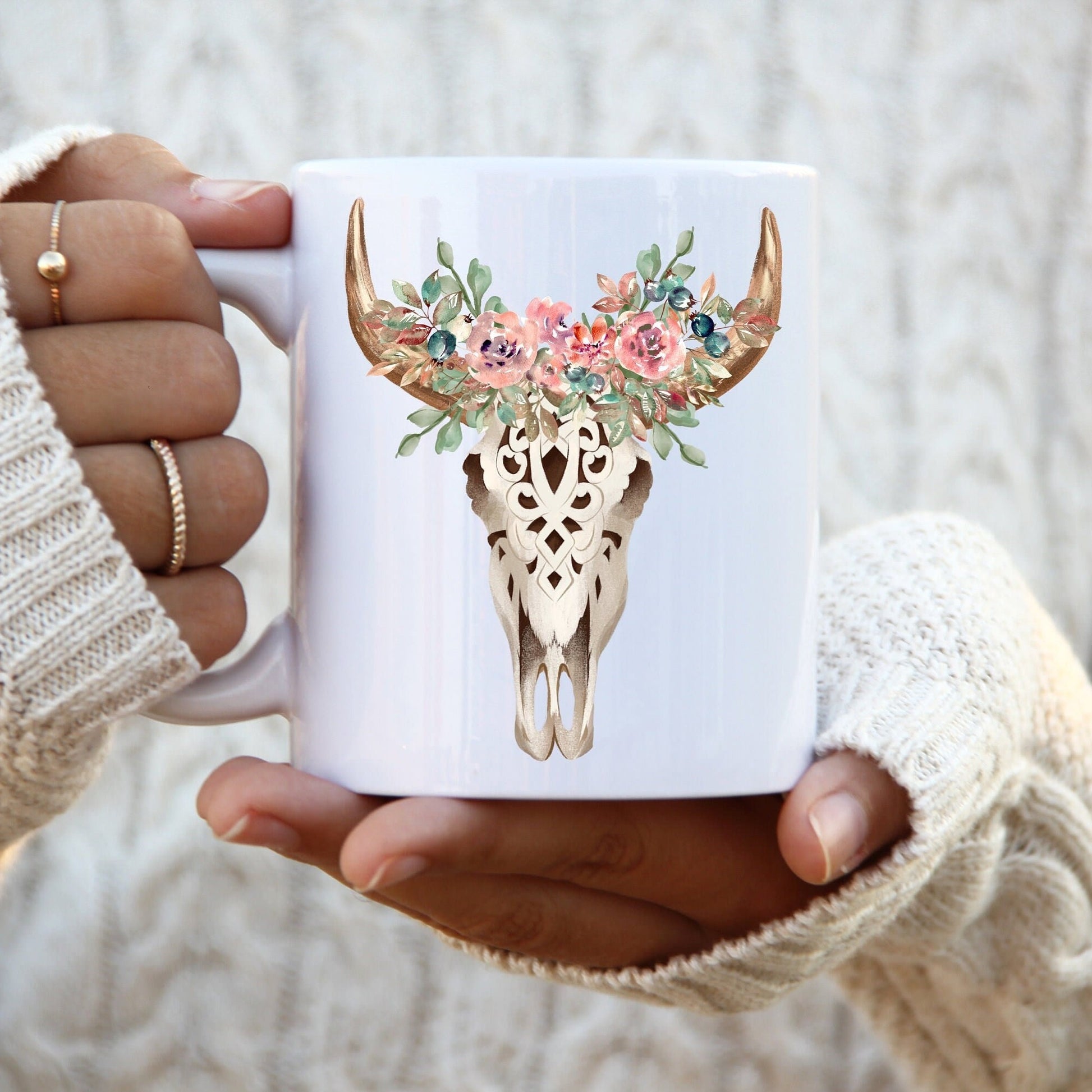 Our Floral Bull Skull mug is the perfect gift for Cowgirls, Nashville lovers, Farm Girls, or anyone who loves a Boho Western Desert Vibe.