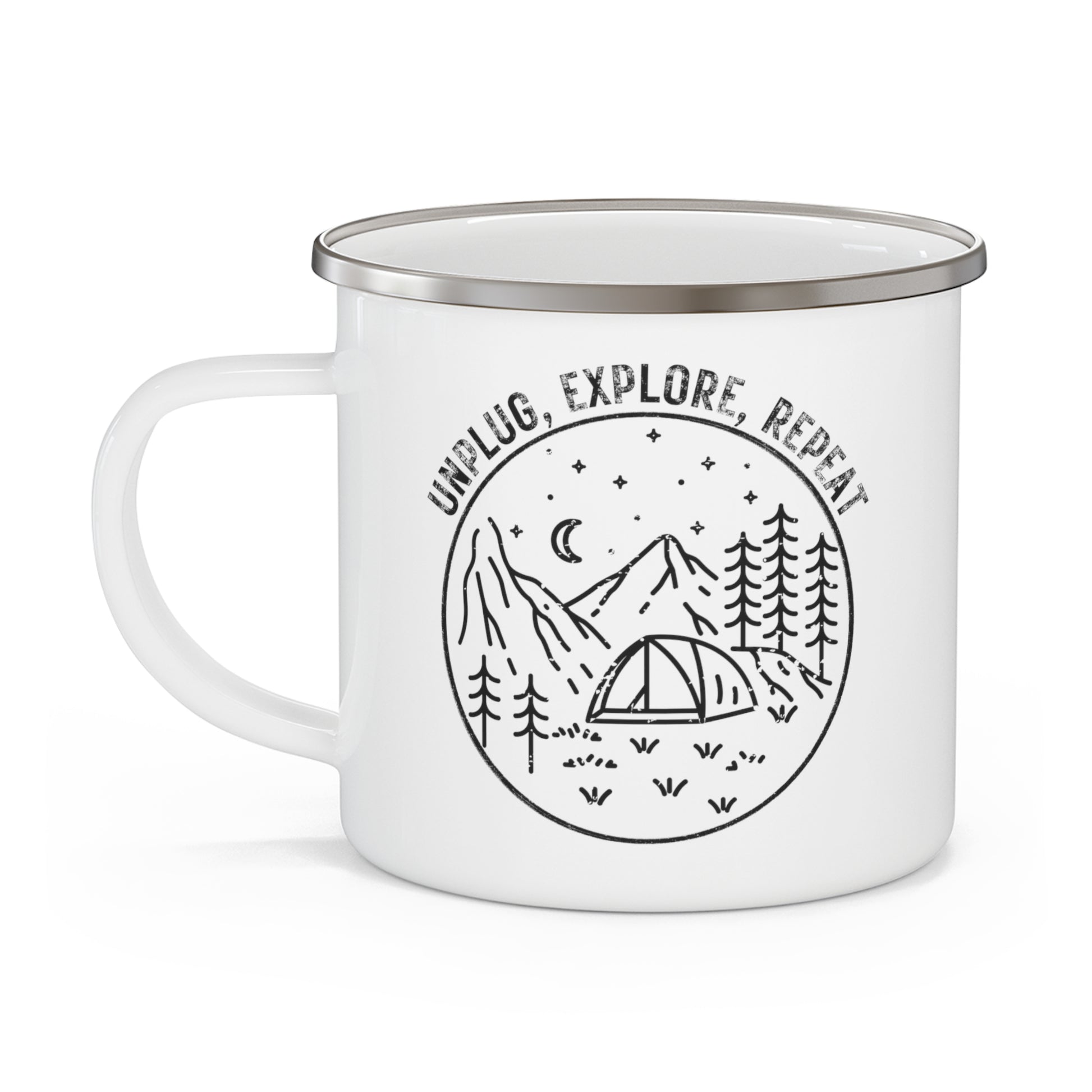 Explore mug, Camping Mug, Camping cup, RV cup, Enamel Camping Mug, enamel mug, Vacation cup, camping mugs, outdoor mugs, rugged mugs, 12 oz