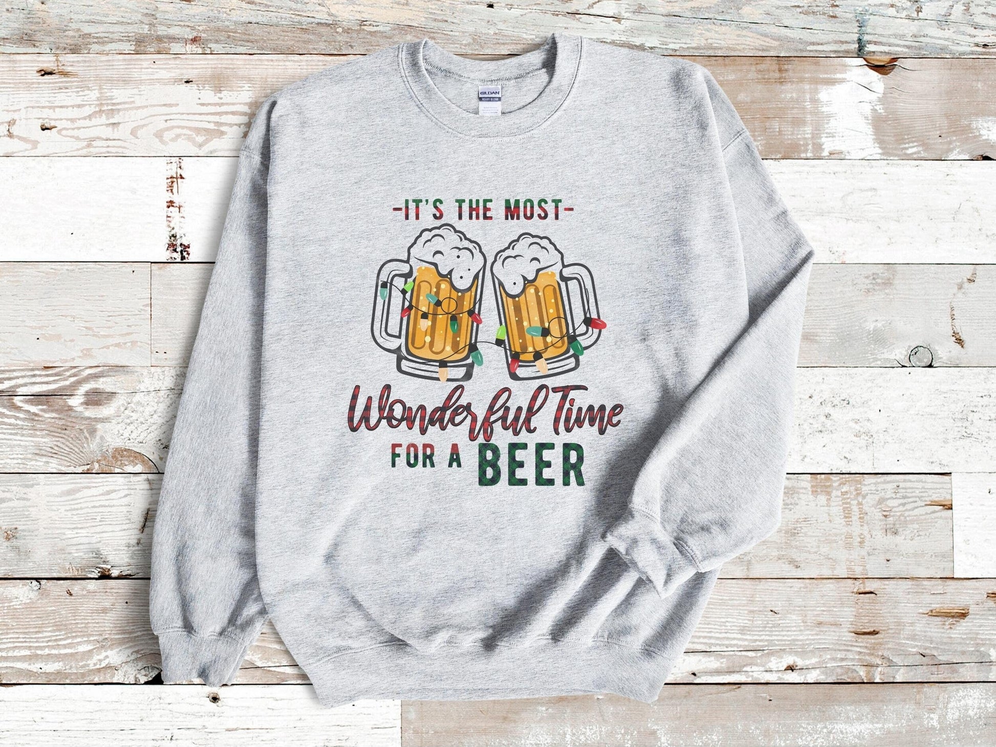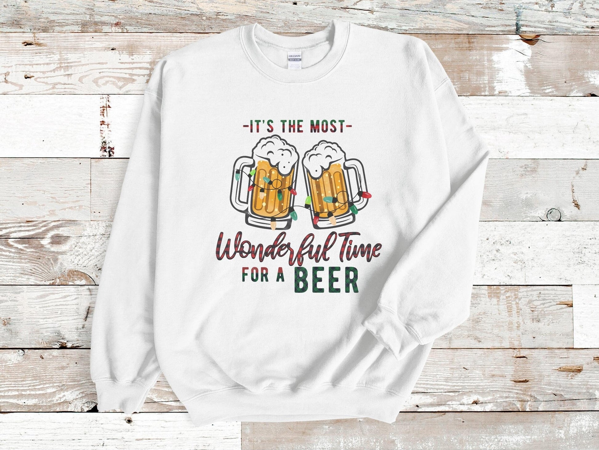Our super funny "It's The Most Wonderful Time For A Beer" Christmas Sweatshirt is perfect Dad, Boyfriend, or any Beer Lover for a Christmas gift sweater! This would make a great dirty Santa gift or be perfect to wear to Christmas parties.