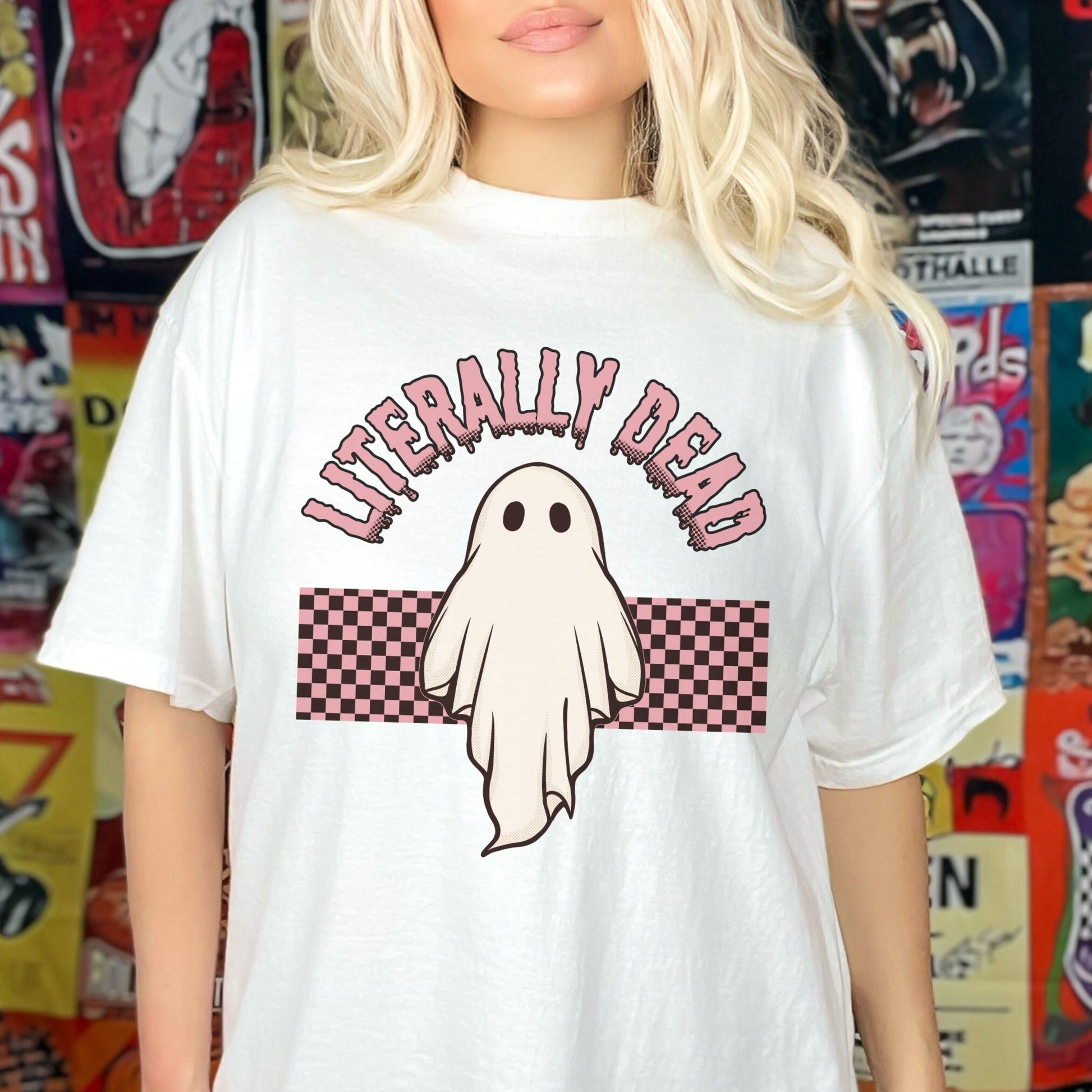 Our funny Retro checkered Ghost Shirt featuring Literally Dead is perfect for Spooky Season, Fall, or anytime.
