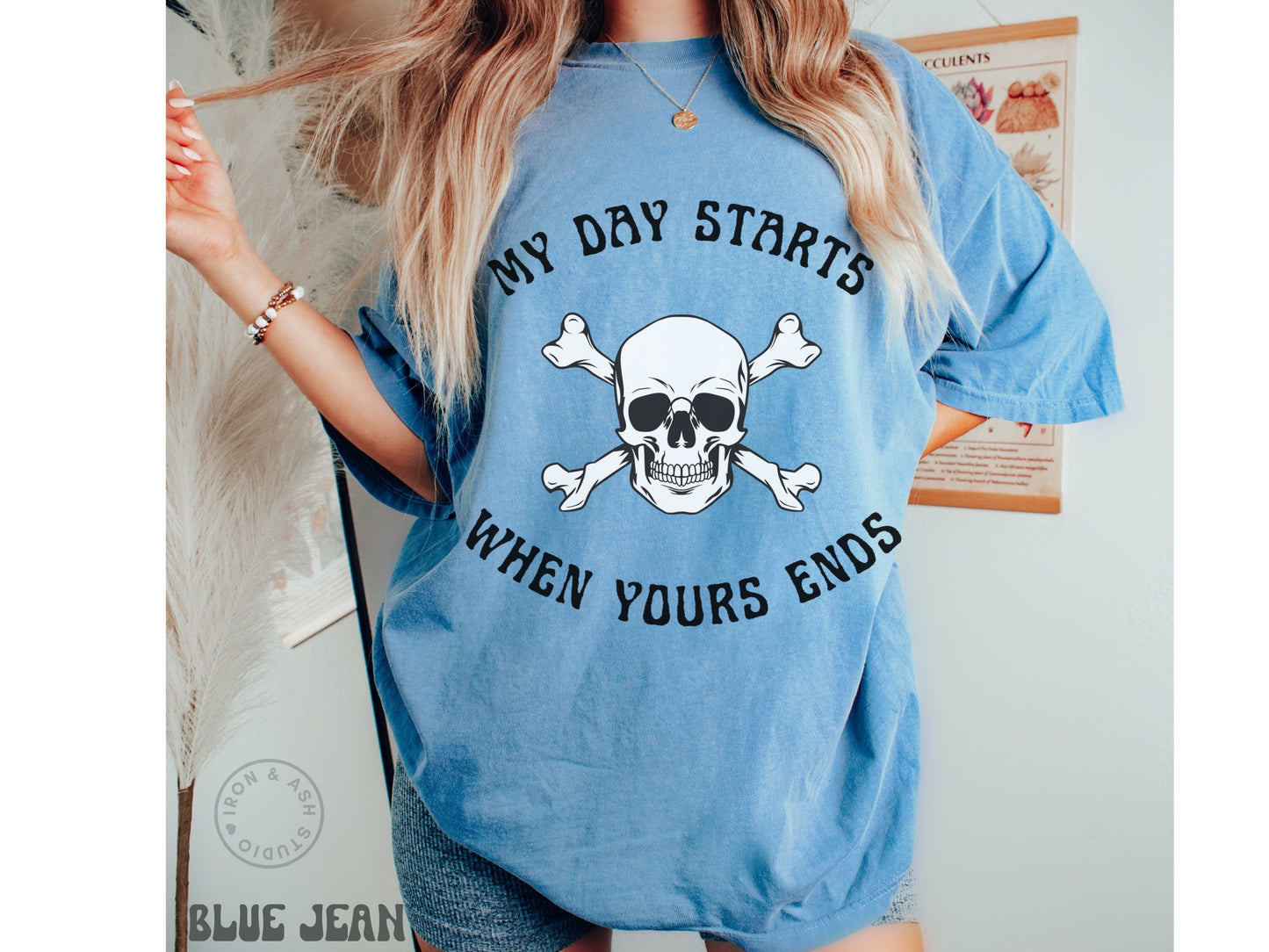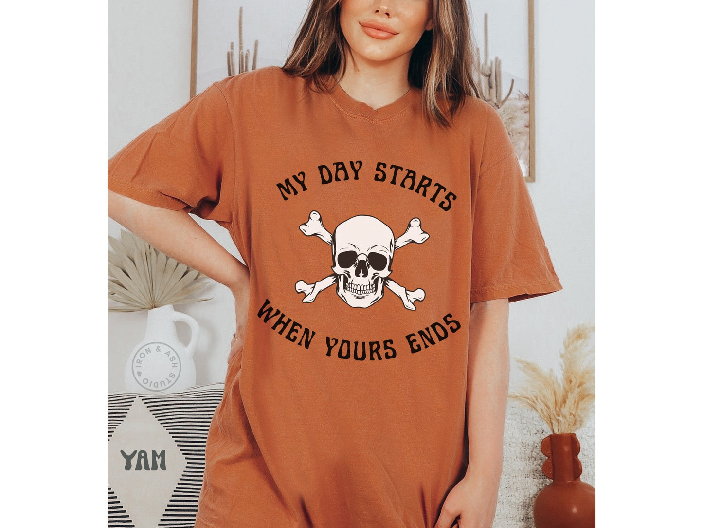 "My Day Starts When Yours Ends" - a funny and darkly humorous t-shirt for morticians, embalmers, funeral directors, last responders with a lighthearted, macabre aesthetic. Perfect for professionals in the funeral industry who have a good sense of humor about their line of work. This shirt is sure to get a few laughs (and maybe a few odd looks) from those who appreciate a good joke about death and the afterlife. Whether you're a mortician, undertaker, or just have a love for all things morbid, this shirt is for you. So why wait? Add this unique and edgy piece to your wardrobe today and start living (or, uh, dying) on the wild side!