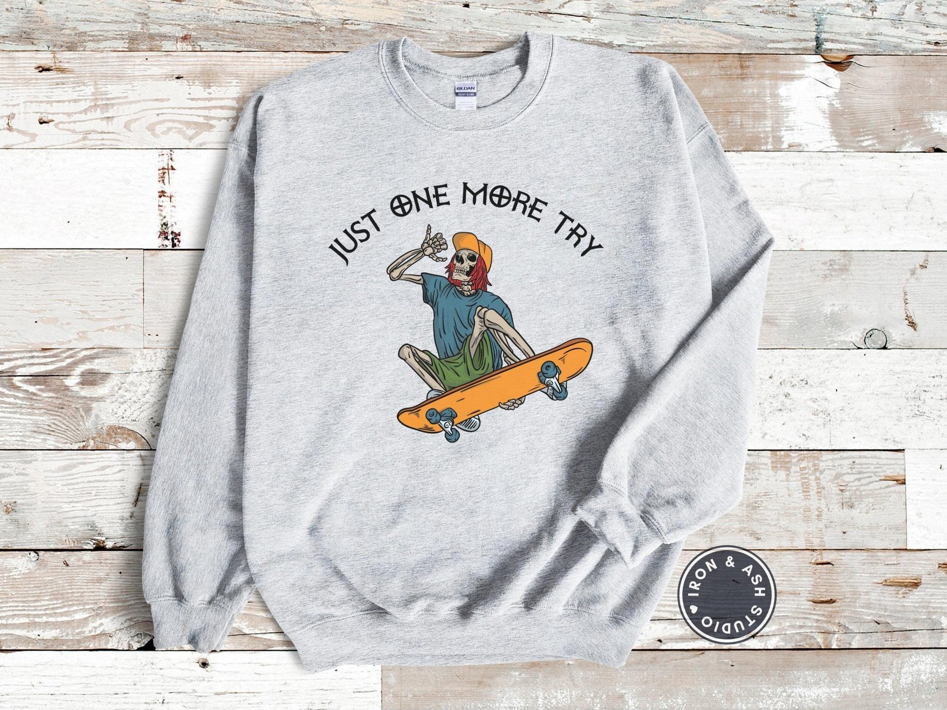 Our funny Sweatshirt featuring Just One More Try with a Skeleton Skater Graphics is the perfect Christmas, birthday or anytime gift for the skateboard lover in your life.