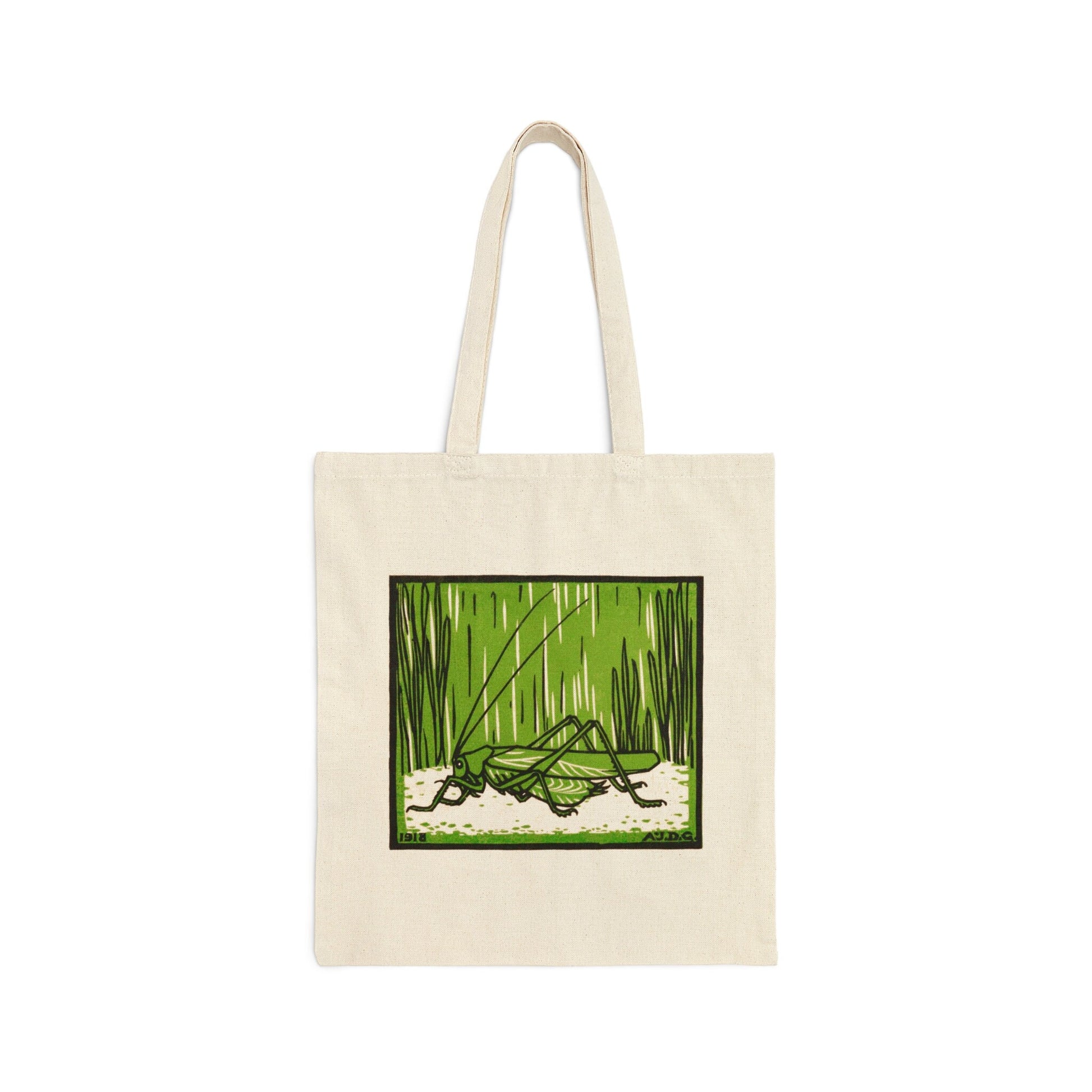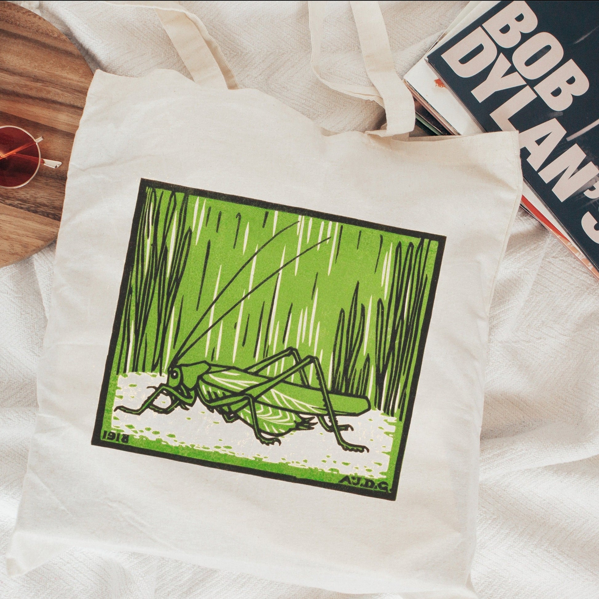 Our vintage 1918 Grashopper print tote featuring artist Julie de Graag is 100% cotton bag comes in one size – 15"" x 16""– perfect for everyday wear. While the canvas material will show off your designs in great colors, it's durable and will last for years. The bag features 20"" handles (made from the same canvas), making it easy to carry even with a week's worth of shopping.