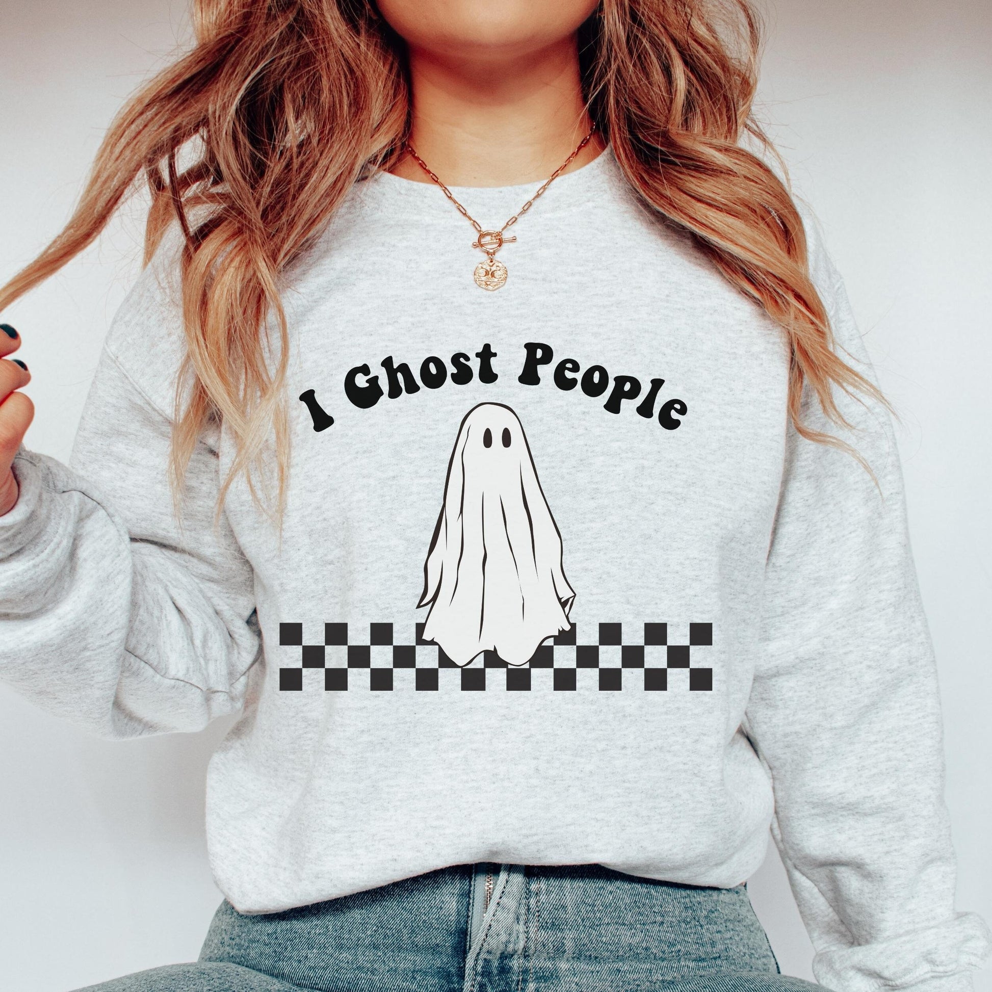 Our hilarious minimalistic, I Ghost People Sweatshirt is perfect for this Fall, Halloween Season, or anytime. Featuring the retro text and checker print which is hugely trending, this is sure to make a perfect addition to your fall wardrobe.