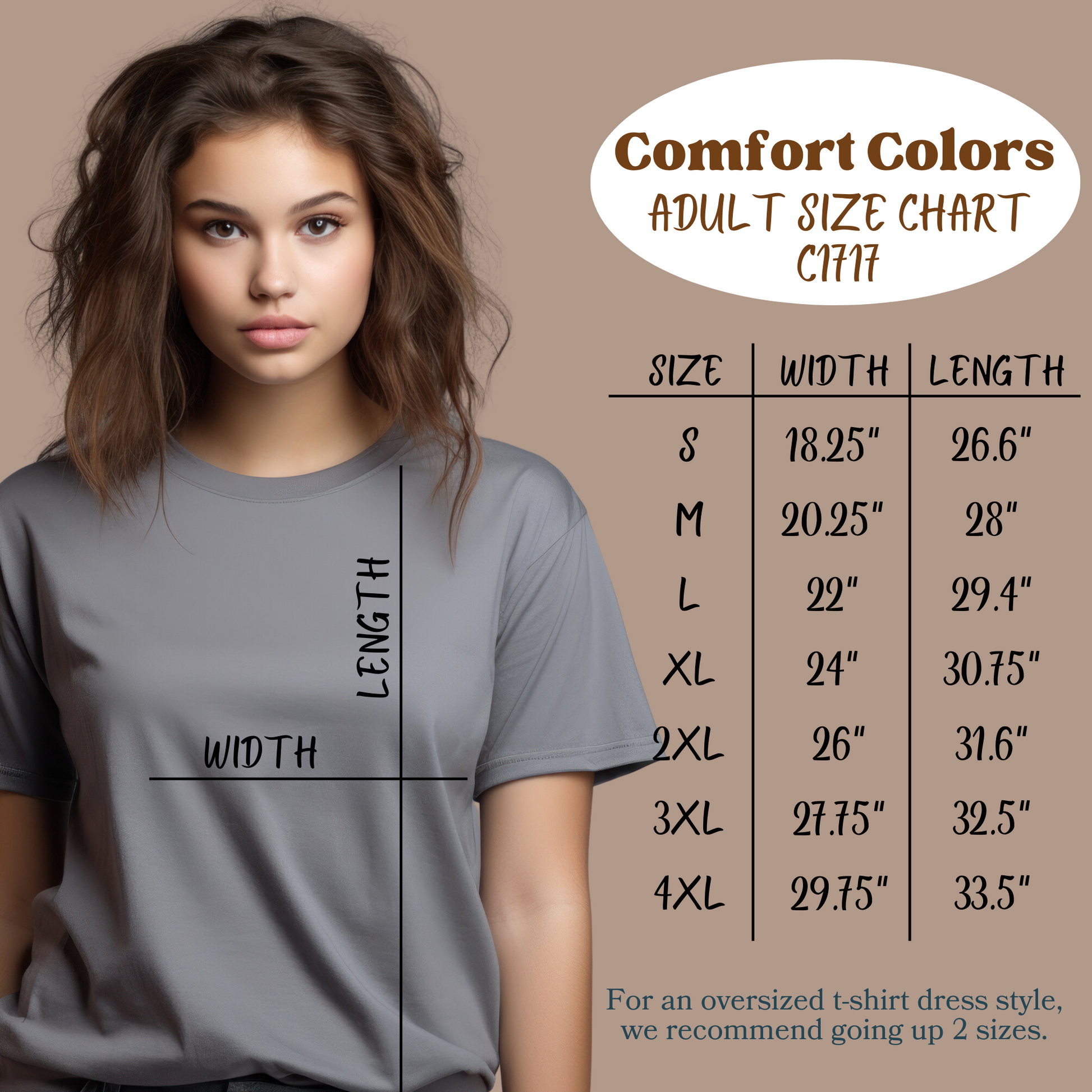 ♥️ SIZING Comfort Colors: PLEASE NOTE: THIS IS A RELAXED, LOOSER FIT, BUT IF YOU WANT A TRULY OVERSIZED FIT, SIZE UP 1-3 SIZES. SIZING Chart and Perfect Fit Guide are in Photo Reel>>>Lay your favorite shirt flat and measure armpit to armpit & compare to sizing chart in photos. No Refunds or Exchanges will be made for sizing issues as items are all custom made to order. Please carefully measure and select your best size for ordering.