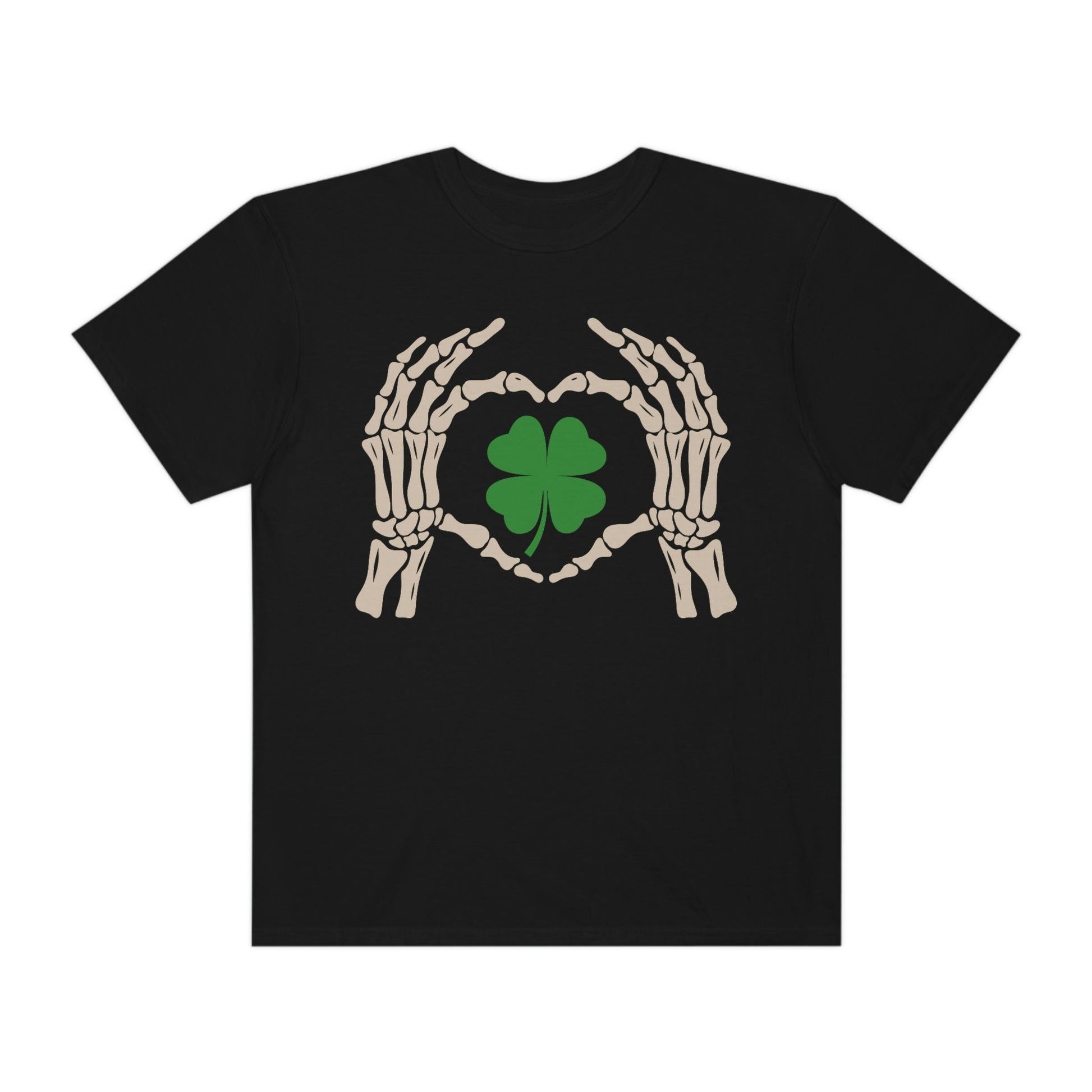 Our one of a kind funny Skeleton hand Shamrock Clover Heart St. Patricks Day Comfort Colors Shirt is the perfect addition to your wardrobe for St. Paddy's Day!